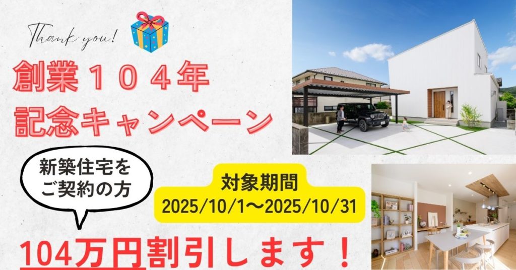 2025年10月1日~31日の期間に新築住宅をご契約いただいた方には、104万円割引をいたします。