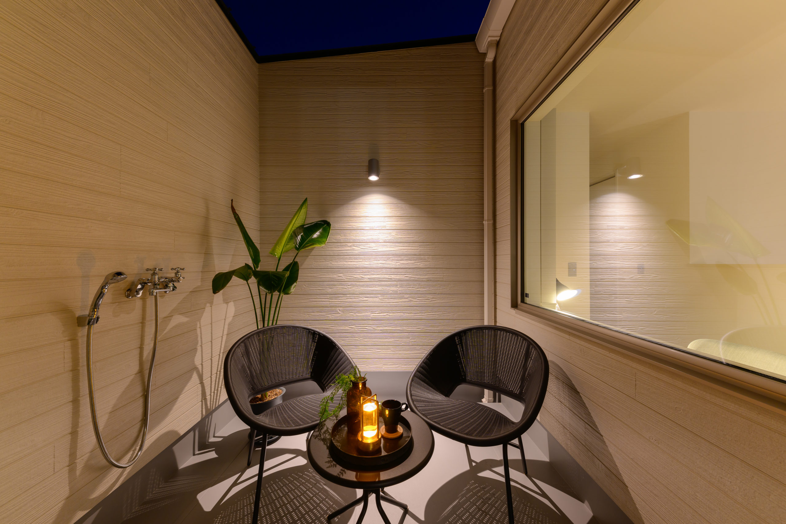 2階中庭という夜の隠れ家。外の目を気にせず過ごせる、ぜいたくな時間。